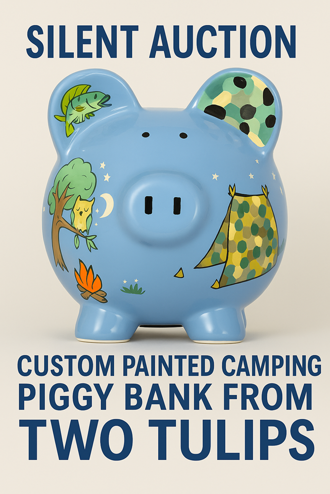 Custom Painted Camping Piggy Bank by Two Tulips Add a touch of whimsy and charm to your home with this one-of-a-kind, hand-painted piggy bank from Two Tulips. This unique ceramic piece features a fun camping theme, complete with colorful tents, trees, stars, and woodland details that make saving money an adventure. Perfect for kids, collectors, or anyone who loves the outdoors, this piggy bank isn’t just functional—it’s a work of art! Start saving for your next big adventure with this adorable keepsake.