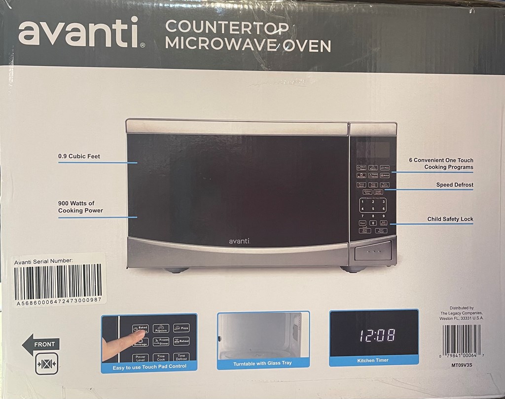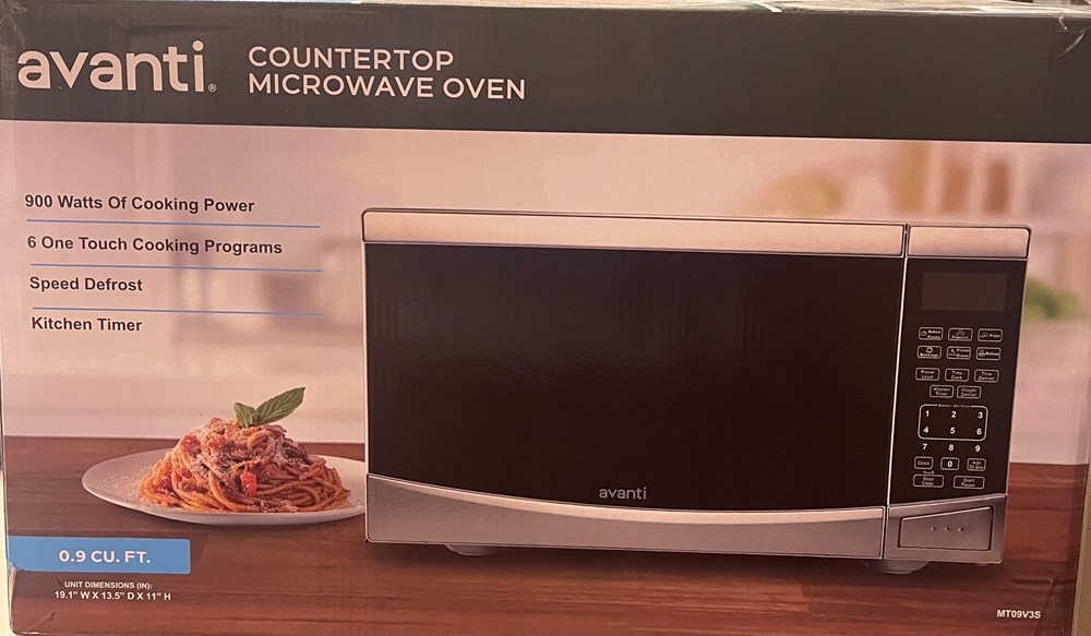 Brand new in box. 900 Watts of cooking power. 6 one touch cooking programs. Speed defrost. Kitchen timer. .9 cu feet Unit dimensions: 19.1” W x 13.5” D x 11” H