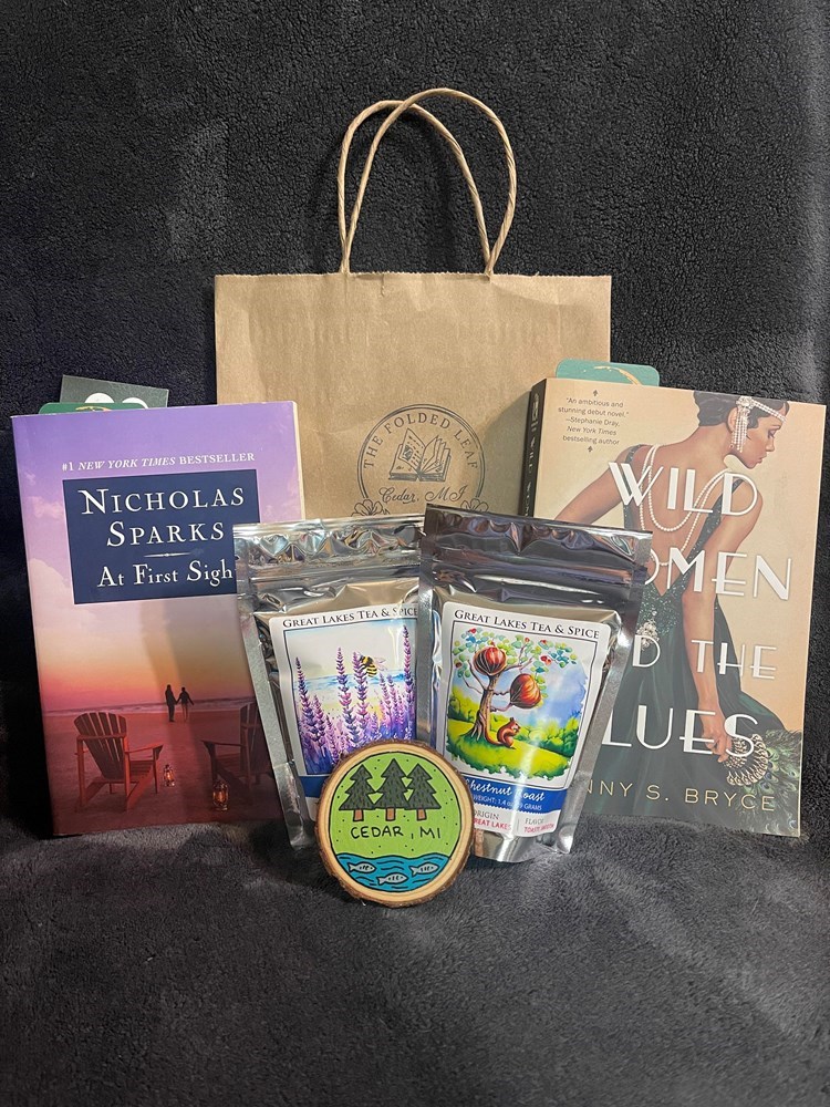 Gift bag of items: -Wild Women & The Blues by Denny S. Bruce -At First Sight by Nicholas Sparks -Great Lakes Tea & Spice: Chestnut Roast -Great Lakes Tea & Spice: Earl Grey Lavender -Cedar Magnet