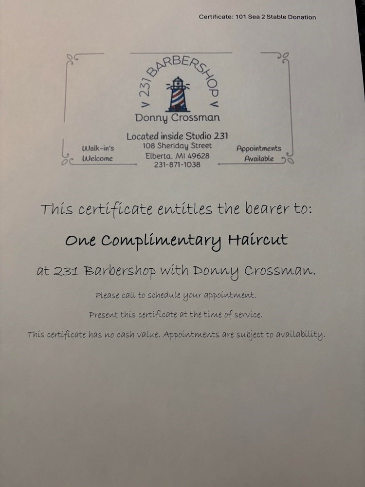 231 barbershop in Elberta donated a haircut by Donny Crossman