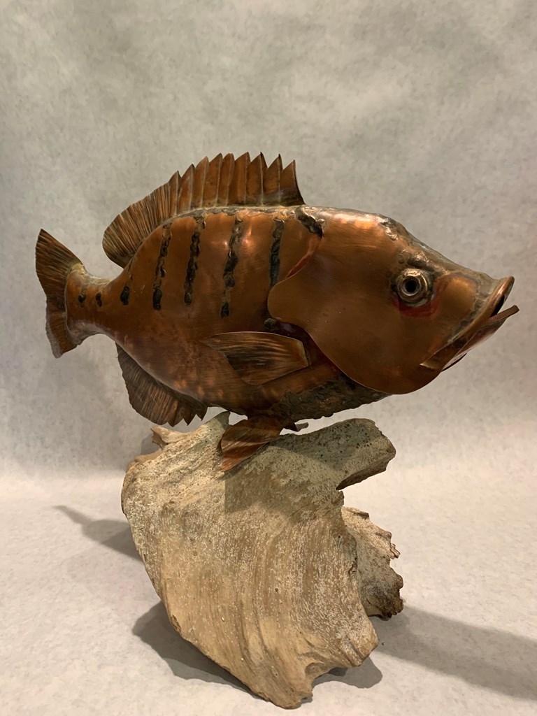 My name is Don Shaw, I hold an MFA degree from FSU. Have been doing shows since the mid seventies from Miami to Northern MI. The piece is welded copper and is approximately 14” wide and 11” tall. Welding is done with a torch and it is entirely shaped by hand. Working title Panfish Searching