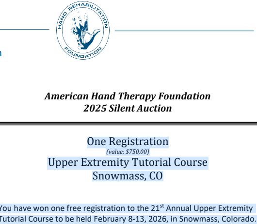 On registration for the 21st Annual Upper Extremity Tutorial Course to be held February 8-13, 2026, in Snowmass, Colorado. “Placing the Hand in Space: Reconstructive Surgery of the Shoulder, Elbow & Wrist” VISIT THEM AT BOOTH #300 https://handfoundation.org/conferences/