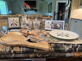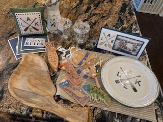 Local pickup from Colleyville, Texas only. Lake decor perfect for someone with a lake house. Lake plate, lake pitcher, tiny pillow, picture frame, cups, wooden bird serving tray, cute lake signs, and more.