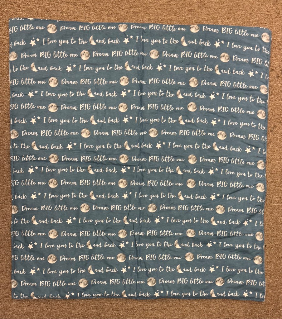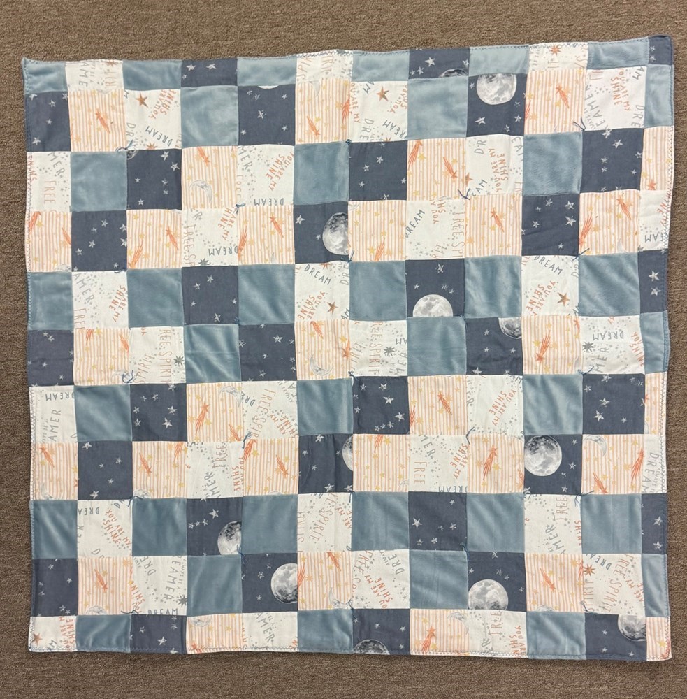 Soft, reversible baby blankets with hand tied knots. Unisex