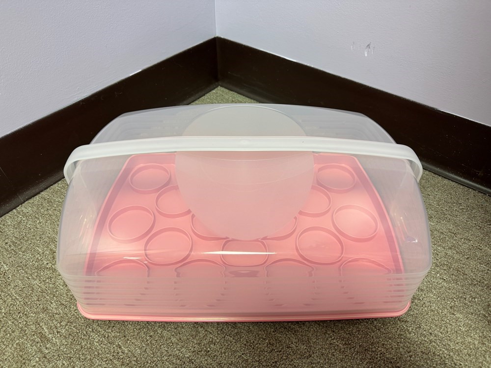 Our Rectangular Cake Taker makes it easy to transport picture-perfect cakes, cupcakes, and other baked goods safely. Serving is also a piece of cake with its large reversible tray. Store and serve a single- or double-layer cake up to 9 x 13 inches/23 x 33 cm big, or flip the tray to hold up to 18 standard cupcakes in their own little wells. Its durable, protective cover fits snugly on the tray to keep baked goods as fresh as when they left your kitchen. Instead of depending on the fit of the cover to lift the tray, the carrying handle locks in to the tray itself for secure lifting and worry-free transporting. Integrated handles on the tray also allow for stable lifting after the carrying handle and cover are removed. The large tray is generously sized for serving all types of goodies on the buffet table, from cakes to charcuterie!