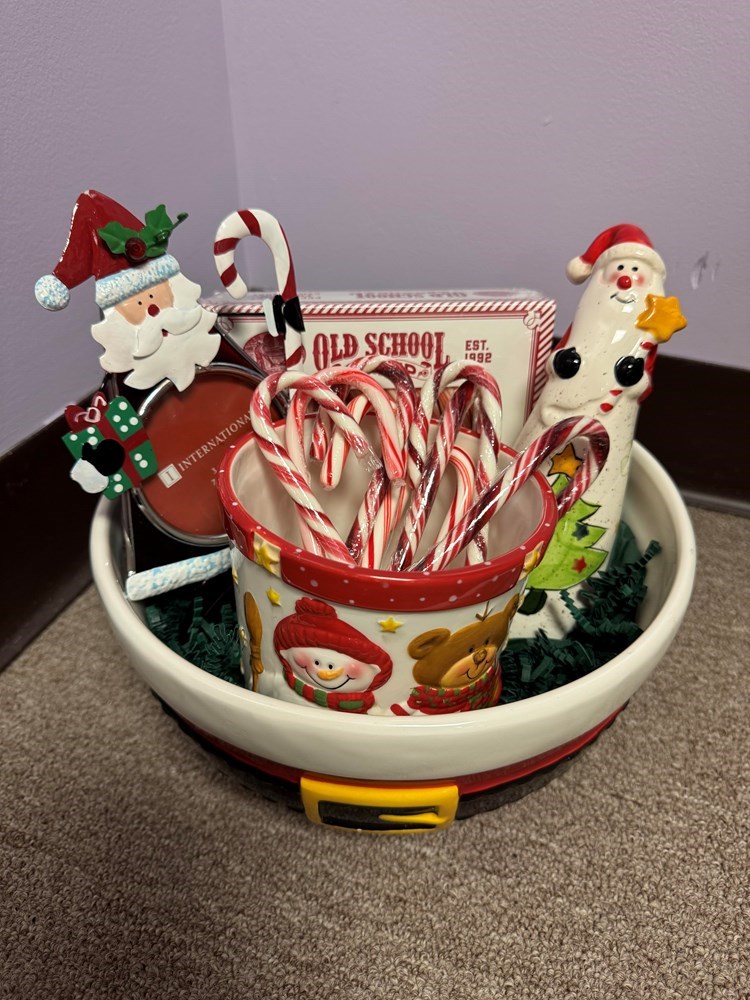 Santa Belt Bowl Candy Dish with Santa and his friends Cnady Canes Peppermint Sticks Santa Clause Photo Frame Santa Figurune with Tree and Star