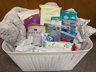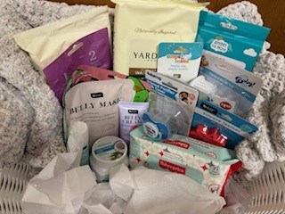 For Mom: Belly Mask. Belly Cream and Balm Stick, 2 Facial Packages - (1 two step and 1 three step), Hand and Nail Glove Set, Hydrating Body Butter, Disposable Washcloths - great for hospital For Baby: Silicone Teether, Cold Pack, Baby Wipes, Soft Comfy Cocheted Baby Blanket - measures 36"x31.5" - perfect for carriers, car seats and floor play, Pacifier Clip, Pacifier with Cover, Diaper Disposable Bags, Comb and Brush Set