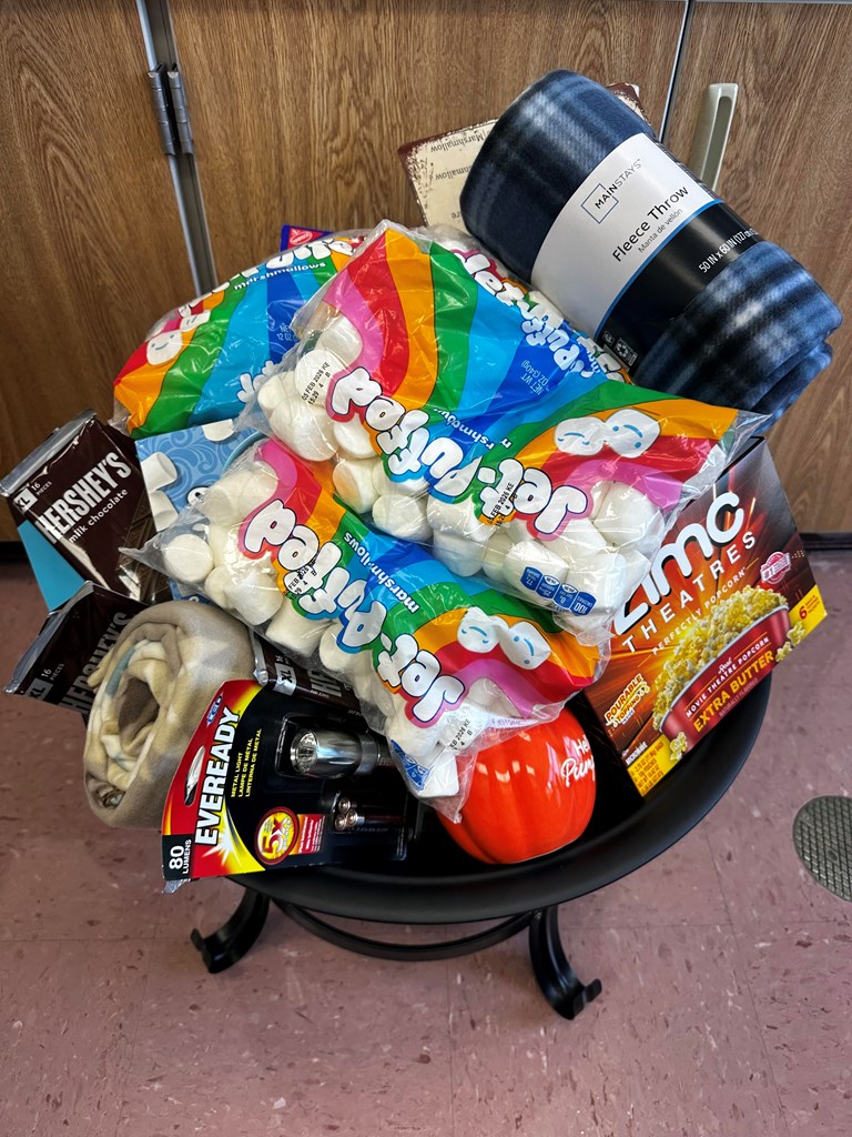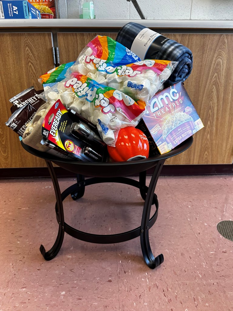 "It's s'more fun by the fire" includes a fire pit, chocolate bars, marshmallows, graham crackers, skewers, hot chocolate mix, coffee mugs, trail mix, popcorn, blankets, flashlights, and bug spray.