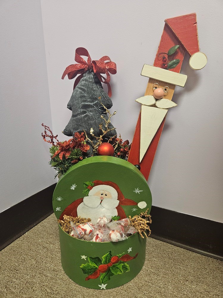 Hand Painted Round Santa and Holly Trimmed Box with Lid Stuffed Denim Tree with Santa Bucket Hand Cut Wooden Skinny Santa with Glasses