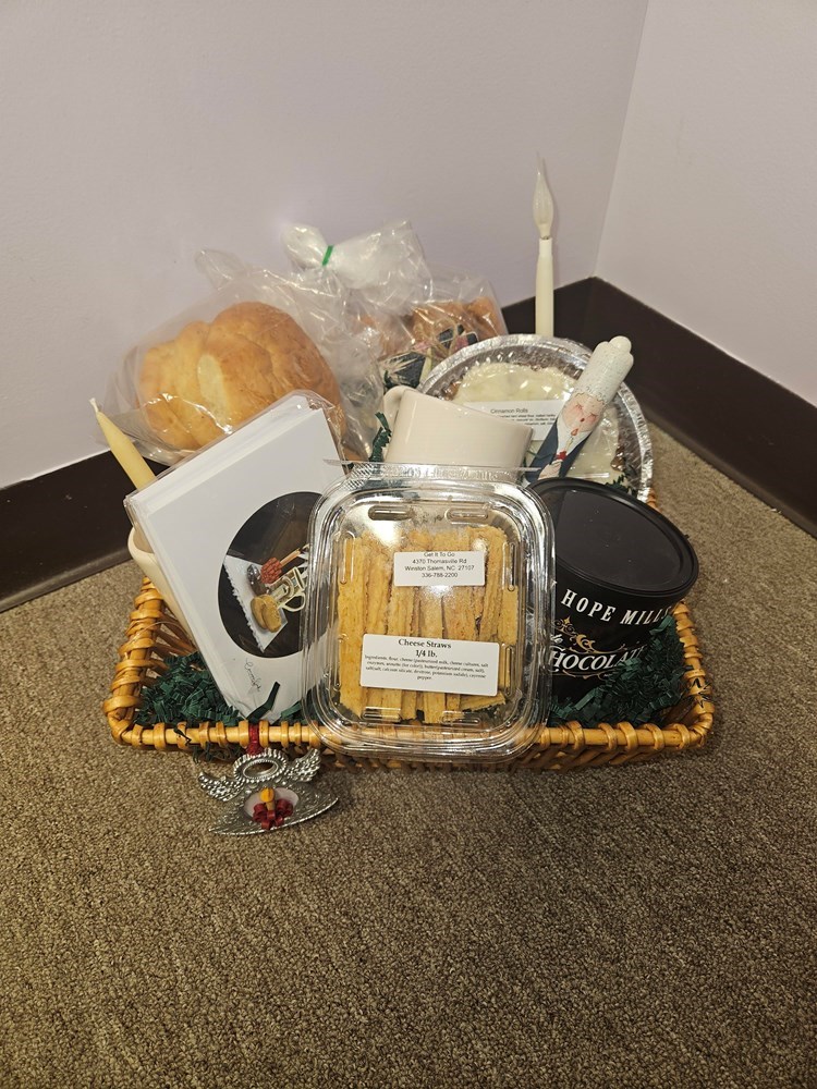 Moravian Sugar Cake 1/2 dozen of Lovefeast Buns Large Tin of Hot Chocolate - Dark Cheese Straws Cinnamon Rolls Lighted Moravian Candle with Red Trim Lovefeast Candle Lovefeast Note Cards by the Late Carrene Sink Handmade and Handpainted Female Diener Figurine Angel Ornament with Lovefeast Candle